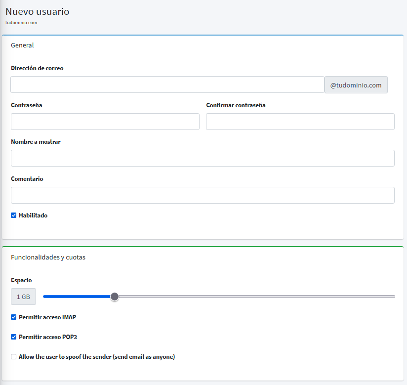 Debemos completar la dirección de correo (sin el @tudominio.com), para ventas@tudominio.com, solo sería "ventas".